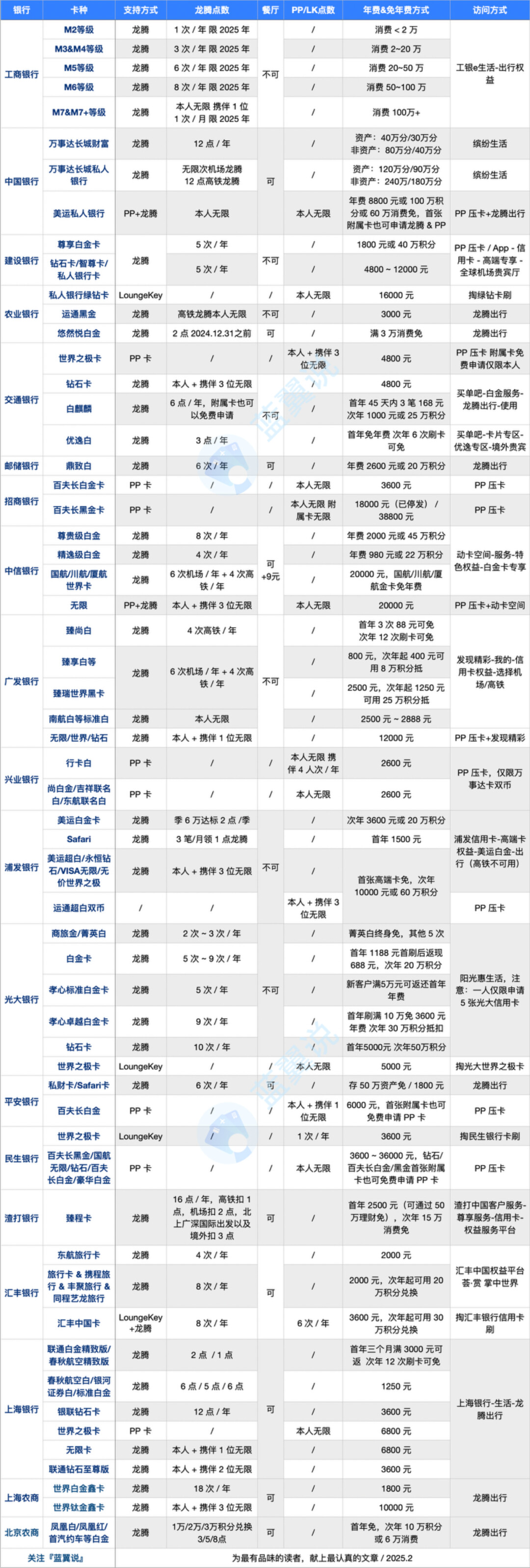 与去年相比,主要变化包括:工行龙腾次数减少且不能用于餐食;上海银行春秋航空联名卡取消龙腾;中行万事达长城私银卡新增机场和高铁龙腾权益;农行运通黑金卡新增不限量高铁休息室权益;广发新增臻瑞世界黑卡。