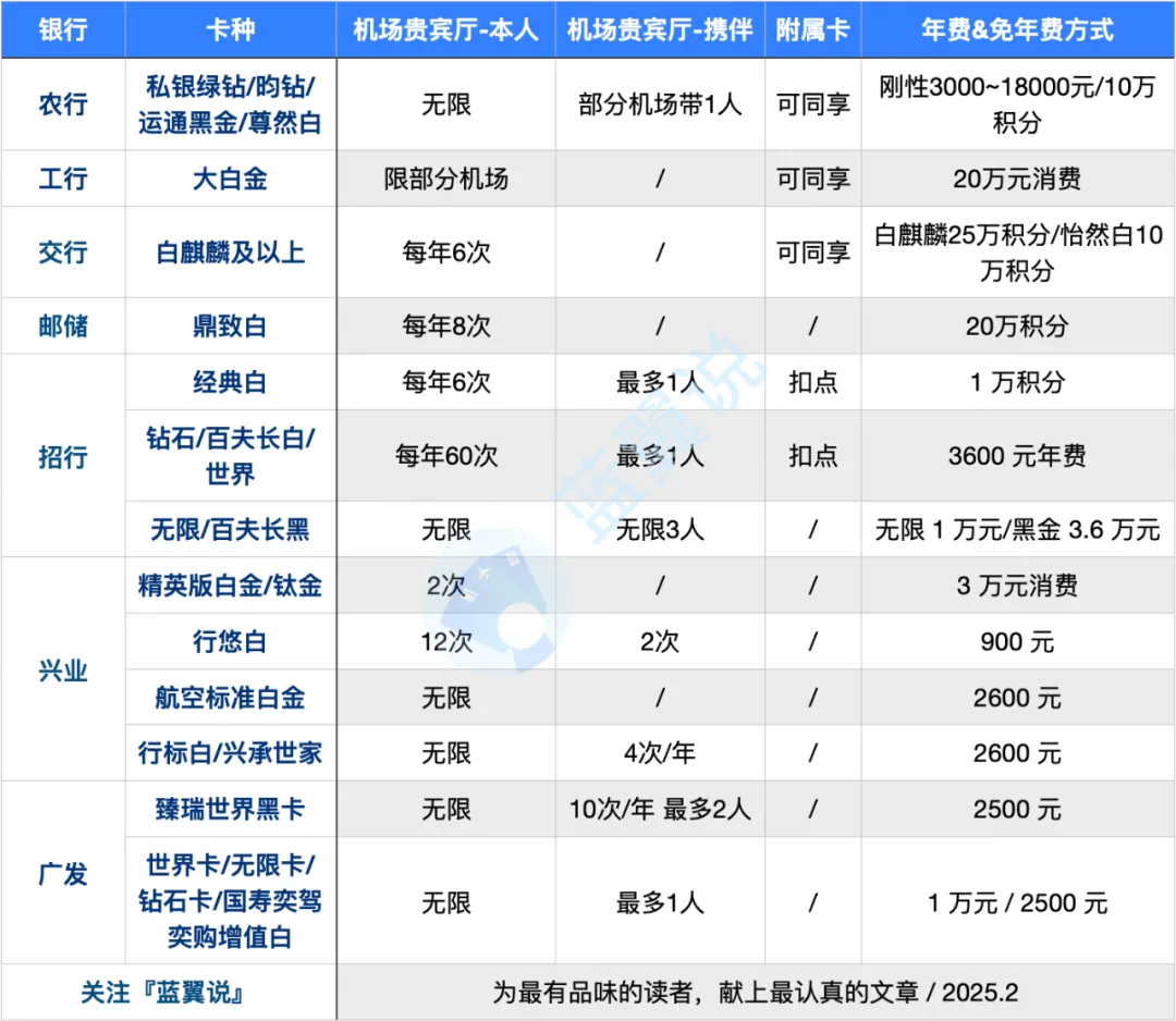 CIP方面,农行依然是易于获取CIP权益的银行,例如尊然白金卡只需每年刷卡30次或10万积分。招行和交行的信用卡也提供CIP权益,且携伴可以使用。