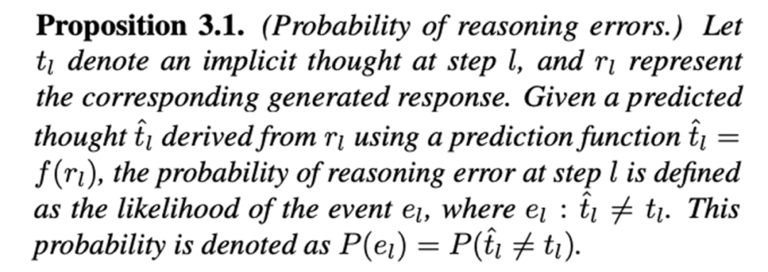 为了准确评估推理错误,研究者首先需要清晰地定义它。由于每个输出 r_l 代表隐式推理步骤 t_l,研究者通过检查是否存在一个足够强大的映射函数 f 来从 r_l 还原 t_l。如果这种还原能力较弱,说明推理过程中信息损失较大,进而导致了推理错误的发生。具体而言,研究者将「推理错误」这一事件刻画如下: