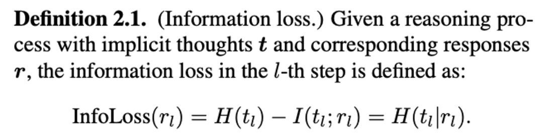 具体而言,在每个推理步骤中,模型的输出可能存在细微偏差,这些误差会逐步累积并导致信息损失。研究者将信息损失定义为互信息 I (t; r) 与隐式推理过程的信息熵 H (t) 之间的差值: