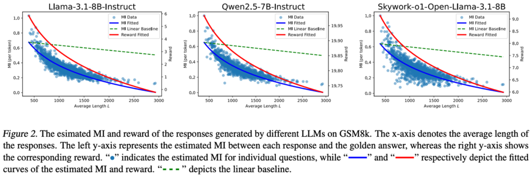 图表 2: 不同 LLM 在 GSM8k 数据集上生成回复的估计互信息(MI)和奖励分数