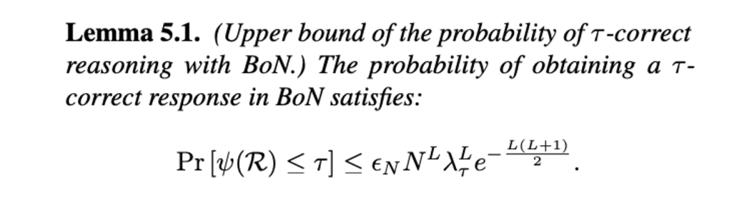 对于 BoN 来说,研究者很方便地将其建模为进行 N 次长度为 L 的推理,并最终在 N 个答案中选择一次的过程。因此,BoN 的正确推理概率上界为: