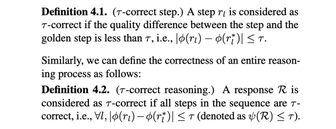 基于上述设定,研究者利用价值函数 φ 评估推理步骤的正确性,并据此量化 LLM 生成回复的质量。具体而言,研究者分别将单步推理和整个推理过程的正确性定义如下: