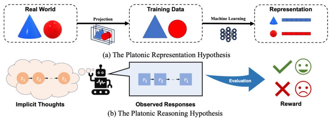 为了更直观地理解这一现象,研究者借助柏拉图的「洞穴寓言」(Plato’s Allegory of the Cave)。在这个寓言中,人们只能看到投射在墙上的影子,而无法直接感知真实世界,类似于 LLM 只能从训练数据中学习世界的「投影」。如图 1 (a) 所示,训练数据只是现实世界的映射,而 LLM 生成的推理结果正如图 1 (b) 所示,仅是其内部推理过程的「影子」。