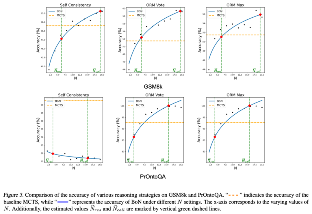 ORM Vote & ORM Max 策略(结合奖励模型):当 N 在 N ̃_res 和 N ̃_call 之间时,BoN 能够达到与 MCTS 相当的推理性能;