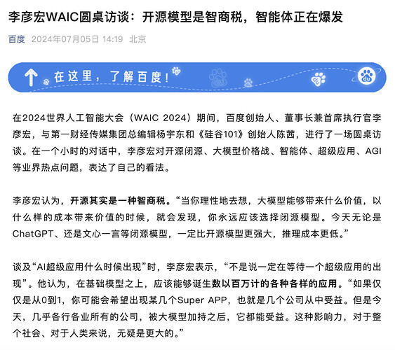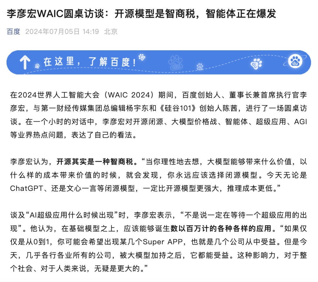 3、李彦宏曾表示开源是一种“智商税”,这次开源是否意味着百度战略的转变?