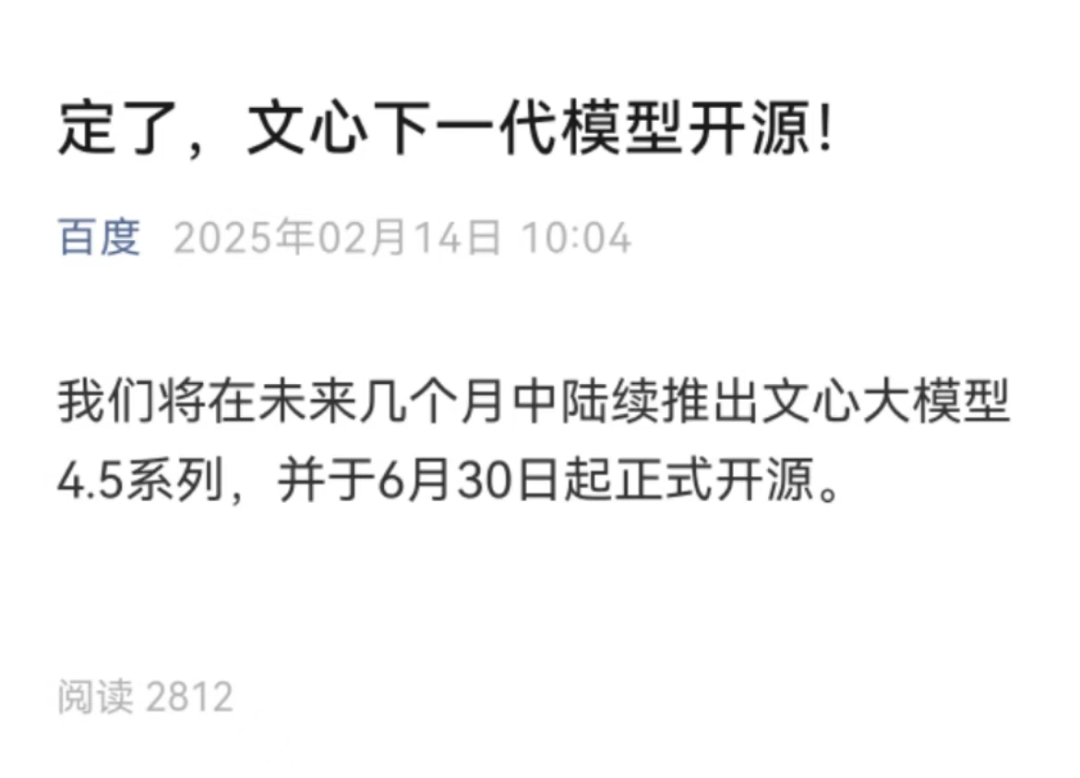 百度宣布文心大模型4.5系列将于6月30日起开源,与李彦宏此前力挺闭源模型的观点 seemingly 相反。