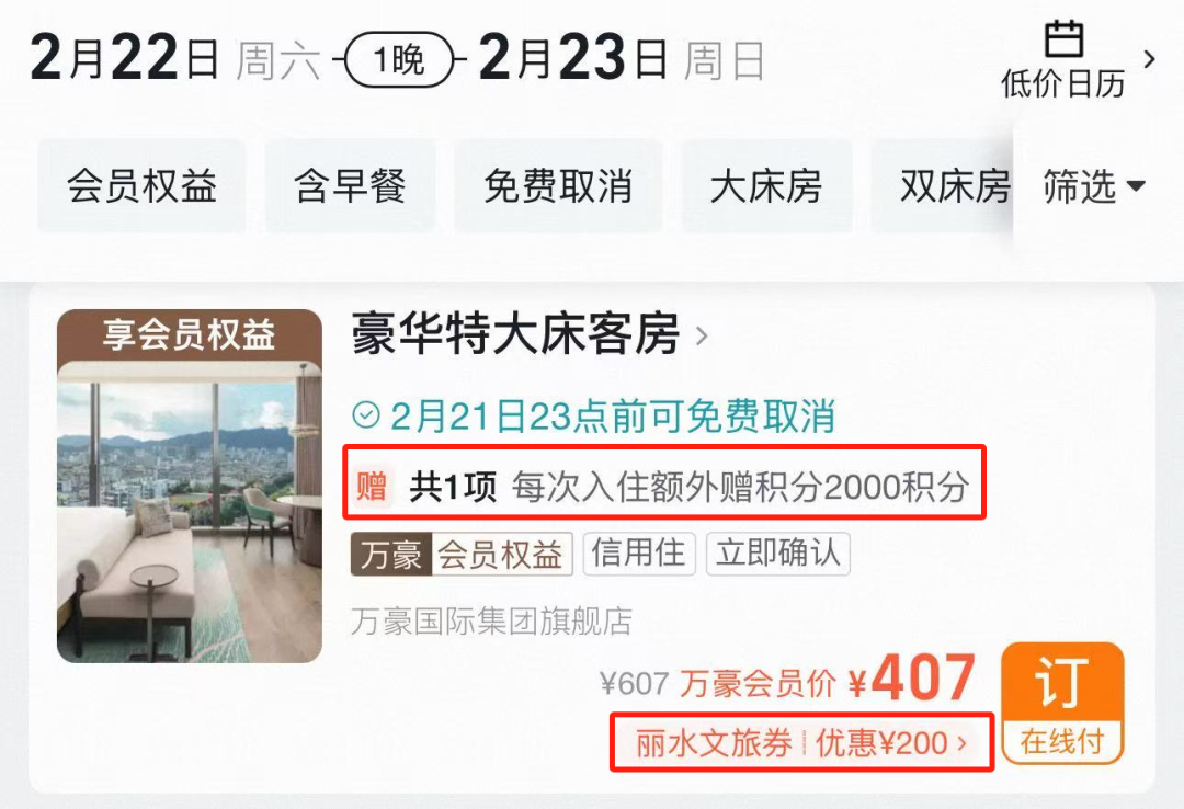 再比如丽水银泰万豪酒店,2月22日周六入住,再用满600-200券后,付407元,每次入住额外赠2000积分。