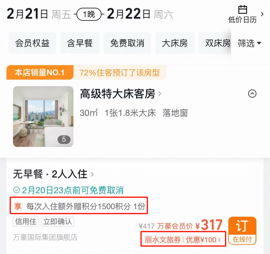 比如丽水银泰源宿酒店,搜2月21日周五入住,用300-100券后,付317元,每次入住额外赠1500积分。