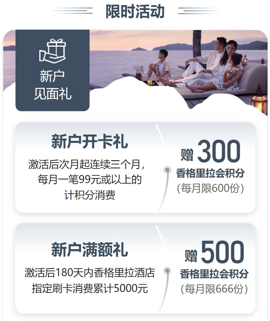 好礼3:开卡日起6个月内于全球香格里拉集团酒店线下刷卡消费累计满人民币5000元(或等值外币),享500额外积分。