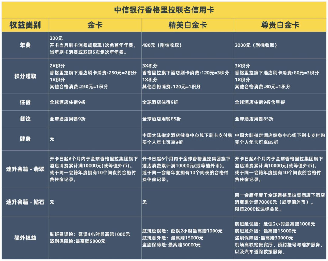 说回主题,聊聊“中信银行香格里拉联名信用卡”。去年年底,联名卡正式发布,共有三个等级:金卡、精英白金卡、尊贵白金卡。