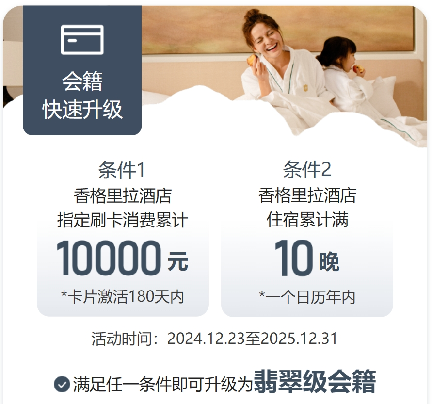 好礼4:开卡日起6个月内于全球香格里拉集团酒店线下刷卡消费累计满人民币10000元(或等值外币),或于同一会籍年度住满10个间夜,可获享翡翠级会籍。