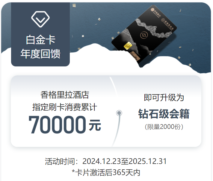另外,如果你申请的是尊贵白金卡,并且在酒店内消费满7万元人民币,则可以升级到钻石会籍(限前2000位达标会员)。