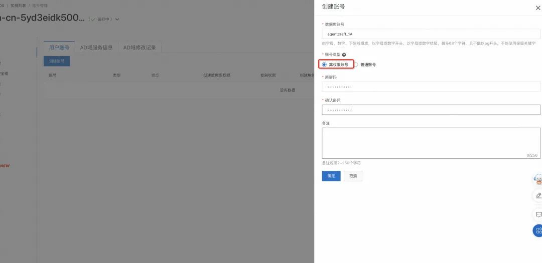 注意选择高权限账号(账号及密码后续会持续使用,请妥善管理。)