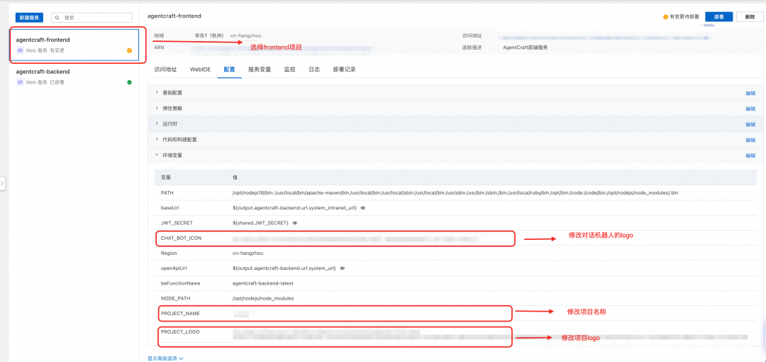 然后进入刚部署的服务,选择 backend, 环境变量。