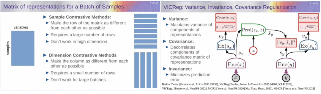 你从编码器中得到一个矩阵,其中包含多个样本,每个向量是一个独立的变量。我们要做的是让每个变量都具有信息性。因此,我们会尝试防止变量的方差变为零,强制它为 1,然后我们会对变量之间进行解相关操作。这意味着我们要计算这个矩阵的协方差矩阵,将矩阵与其转置相乘,然后尽量让结果的协方差矩阵接近单位矩阵。还有其他方法试图让样本正交,而不是让变量正交,这些方法属于对比样本的方法。但是,它们在高维度时不起作用,而且需要较大的批量数据。