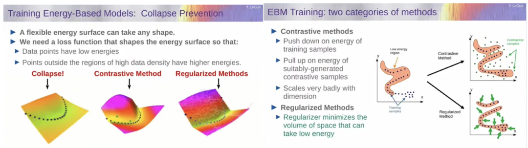 这就导致了两种不同类型的学习过程,一种是对比学习过程,你需要生成那些对比点,然后将它们的能量推高到某个损失函数(Loss Function)。而另一种是使用正则化方法,它将“收缩”数据流形,确保流形外的能量较高。