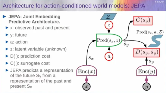 在这个架构中,你有一个编码器,X 是当前世界的状态或当前观测值。然后,你将一个动作输入到预测器中,这个动作是你想象的执行动作,预测器会预测下一个世界状态的表示,这就是你如何进行规划的方式。所以,我们需要训练这些系统,并且需要弄清楚如何训练这些 JEPA 架构。
