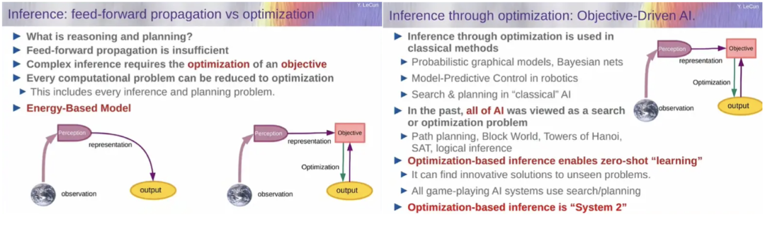 而在经典 AI、统计学、结构预测等不同领域,推理的方式是通过一个函数来衡量观测值与拟输出之间是否兼容,寻找一个输出值,将不兼容性度最小化,我们将这个函数称为“能量函数(Energy Function)”,如下图右侧红色方框所示,这样系统就会通过优化来进行推理。如果推理问题更复杂,系统就会花更多时间来进行推理,而对于简单的问题,它会花费较少的时间。