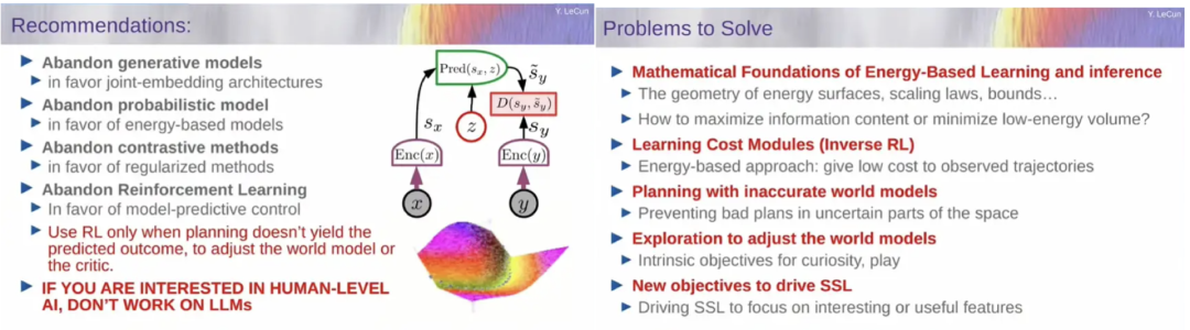 我有一些建议:首先,放弃生成模型。 虽然,这是目前大家都在研究的最流行的方法,但请停止继续在这个方向上工作,转而研究 JEA;第二,放弃概率模型,转向 EBM;第三,放弃对比方法,转向正则化方法;最后,放弃强化学习,这是我长期以来一直在强调的,因为它效率低下。你只有在模型不准确或代价函数不准确时,才需要使用强化学习。