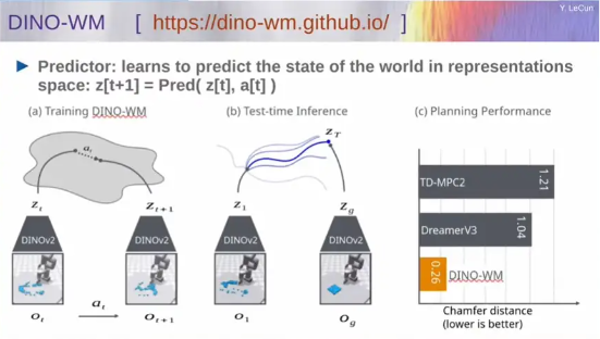 最新的工作是基于 Dino 的世界模型。这是使用 Dino 特征,并在其上训练一个预测器,使其成为一个基于动作条件的世界模型,从而可以用于规划。基本的做法是,训练一个预测器,使用通过 Dino 编码器处理后的世界图像,并结合机器人可能采取的动作。然后,你通过这个系统预测接下来会发生什么,即根据所采取的动作预测接下来的图像或视频帧。