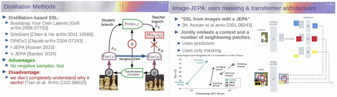 对于蒸馏,现在有一些理论研究。实际上,这项工作刚刚完成,它为什么会有效的原因仍然有些神秘。老实说,我对这种方法有点感到不太舒服,但我们必须接受它实际上是有效的。真正的工程师在构建东西时未必知道为什么它能工作,但他们能够做出有效的成果,那才是好工程师。这种方法不需要负样本,它们的系统可以学习通用特征,之后你可以将这些特征应用到任何下游任务中,而这些特征的效果非常好。所以,这种方法非常有效。