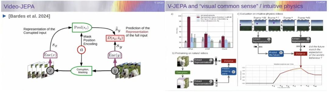 最近,我们开发了一个适用于视频的版本——V-JEPA。这个系统从视频中获取 16 帧的片段,然后对这些 16 帧进行腐蚀,通过遮盖其中的一部分,再将其输入到相同的编码器中。接着,训练一个预测器,从部分遮盖或腐蚀的表示中预测完整视频的表示。它的效果非常好,因为你可以学习到一些特征,然后将这些特征输入到一个系统中,这个系统能够对视频中的动作进行分类,并且使用这些方法,你能获得非常好的结果。