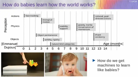 那么,人类婴儿是如何学习世界运作的呢?婴儿在生命的最初几个月内,就积累了大量关于世界的背景知识,比如物体恒常性、坚固性、刚性、自然物体类别等概念。在婴儿理解语言之前,他们已经能够区分桌子和椅子的不同,这种能力是自然而然发展的。四个月大之前,婴儿基本上无法对世界产生任何影响,但之后通过与外界的互动,他们的理解逐渐深化,大约在九个月大的时候就能够理解一些直观的物理概念,比如重力、惯性等。需要的互动量并不大,但仍然是非常重要的。所以,如果我们想要开发一个能够最终达到人类智能水平的人工智能系统,这个过程可能会需要很长时间。