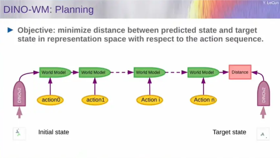 这个规划过程非常简单。你首先观察初始状态,将其输入到 Dino 编码器中,然后通过你的世界模型进行多步预测,想象执行一系列动作。接着,你有一个目标状态,例如通过目标图像来表示,运行到编码器中,然后计算预测状态和目标图像所代表的状态之间在状态空间中的距离。规划的过程实际上就是通过优化找到一系列动作,并最小化距离。