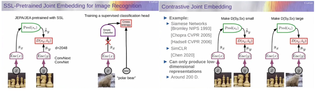有很多技术可以用来实现这一点。大约五六年前,我们让系统学习图像的表示。取一张图像,对其进行某种方式的腐蚀或转换,然后将原始图像和腐蚀后的版本输入到相同的编码器中,并训练一个预测器,从腐蚀后的图像中预测原始图像的表示。当系统训练完成后,去掉预测器,使用编码器输出的表示作为输入,提供给一个简单的线性分类器,或者类似的监督训练方法,来验证学习到的表示是否良好。这个想法非常古老,可以追溯到 1990 年代,被称为 SII 网络(Siamese Networks)。而一些关于 JEPA 的最新研究则是在此基础上增加了预测器,例如,谷歌提出的 SimCLR。