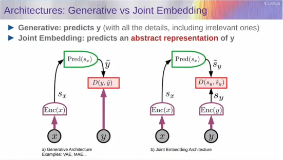 让我们来比较这两种架构。左边是生成架构,你将观测数据 X 通过编码器输入,然后可能通过预测器或解码器生成预测结果 Y,这是一种直接的预测方法。而在右边是 JEPA 架构,你将 X 和 Y 都输入到编码器中,编码器可以相同也可以不同,然后从 X 的表示中预测 Y 的表示,这个表示位于一个抽象空间中。