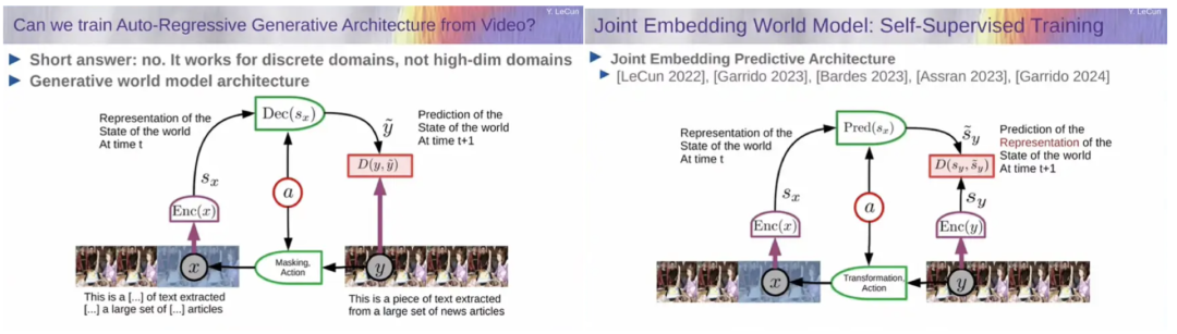 我们需要这样做的原因,当然是因为我们无法精确预测世界上将会发生什么。如果我们训练一个系统仅仅去预测一个帧,它将无法做得很好。因此,解决这个问题的方法是一种新的架构,我称之为“联合嵌入预测架构”(Joint Embedding Predictive Architecture, JEPA),因为生成架构对于视频生成来说根本行不通。
