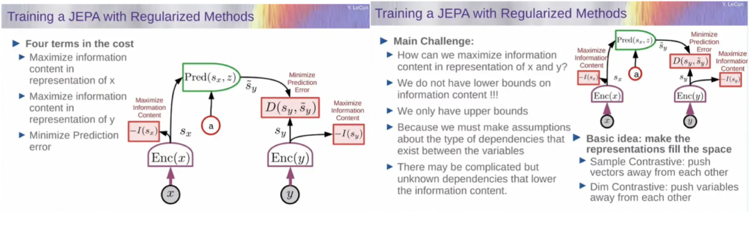 然而,这里维度是受到限制的。我们可以用正则化方法训练 JEPA,工作方式如下:让编码器基本上忽略输入,产生一个常量输出,这样预测误差始终为零。你还需要防止系统发生崩溃,实现这一目标的间接方式是保持从编码器输出的信息内容。你将有一个训练目标函数,它是负信息内容(因为在机器学习中通常是最小化而不是最大化)。一种做法是,将来自编码器的表示向量在一个样本批次中进行处理,确保它们包含有意义的信息。如何做到呢?你可以取出表示向量的矩阵,并计算该矩阵与其转置矩阵的乘积,得到一个协方差矩阵,然后尝试使这个协方差矩阵接近单位矩阵。
