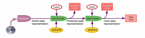 现在,你有了一个世界模型,执行第一动作后预测下一个状态、第二个动作预测第二个状态。你可以在整个轨迹中设置护栏、成本和任务目标。如果世界并非完全确定和可预测,世界模型可能需要包含潜在变量(Latent Variable),以考虑我们无法观察到的世界中的各种因素,这些因素使预测变得不完全精确,最终导致推理的不确定性。