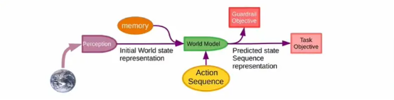 有了这样一个世界模型的话,我们就可以将其输入到目标函数中,目标函数是衡量预测的最终状态是否满足我们设定目标的函数,类似一个成本函数。我们还可以设置一些“护栏”目标(Guardrail Objectives),把它们看作是系统必须满足的约束条件,以保证系统的安全行为。系统的运行方式是通过优化来进行的,寻找一个能够最小化任务目标和护栏目标的动作序列来执行。我们这里讨论的并不是学习,而是推理。这种方法可以确保系统的安全性,因为护栏目标确保了安全性,由硬编码实现,你无法通过给系统提供一个提示,使它逃避护栏目标。