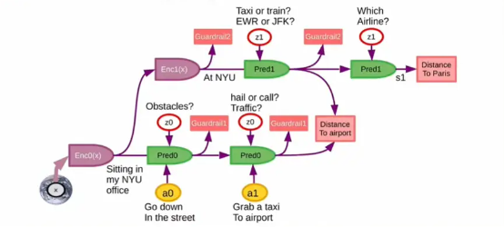 举个例子,如果我在纽约大学的办公室里决定去巴黎,我可以将这个任务分解成两个子任务:去机场和坐飞机。现在,我有了一个子目标——去机场。去机场的过程包括走到街上、打车。那么,如何走到街上呢?我需要走到电梯、按下按钮、乘电梯下楼、走出大楼。如何去电梯呢?我需要从椅子上站起来、拿起包、开门、走到电梯、避开所有障碍物,直到某个时刻,我不再需要规划,直接开始行动。