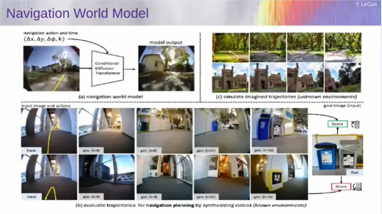 我们将类似的想法应用于导航任务。基本上,这是视频序列的应用,每一帧都是在特定时刻捕获的,机器人通过里程计知道自己移动了多远,从而获得下一帧。你训练一个系统,预测如果执行某个特定的运动动作,世界会是什么样子。接下来,你可以告诉系统,比如“导航到那个点”,系统就会执行,并在过程中避开障碍物。