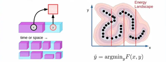 解释这一过程的理论框架是能量基模型(Energy-Based Models),你可以通过一个能量函数来捕捉变量之间的依赖关系。比如,这个能量函数在 X 和 Y 兼容时取较低的值,而在 X 和 Y 不兼容时取较大的值。你并不是直接从 X 计算 Y,而是利用一个能量函数来衡量不兼容度,然后在给定 X 的情况下,找到一个能量值低的 Y。