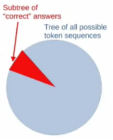 人们通常把这种方式称为 Generative Pre-trained Transformer(GPT),它很高效,但存在一个问题:它是发散的。每生成一个 token,都有可能生成一个不在合理答案范围内的 token,从而将生成结果推向更不合理的方向。如果发生这种情况,之后就无法修正。而如果假设生成错误 token 的概率是存在的,并且假设这些错误是独立的(当然它们并非独立),那么就会导致指数级的发散,这也就是为什么这些模型会出现“幻觉”的原因。