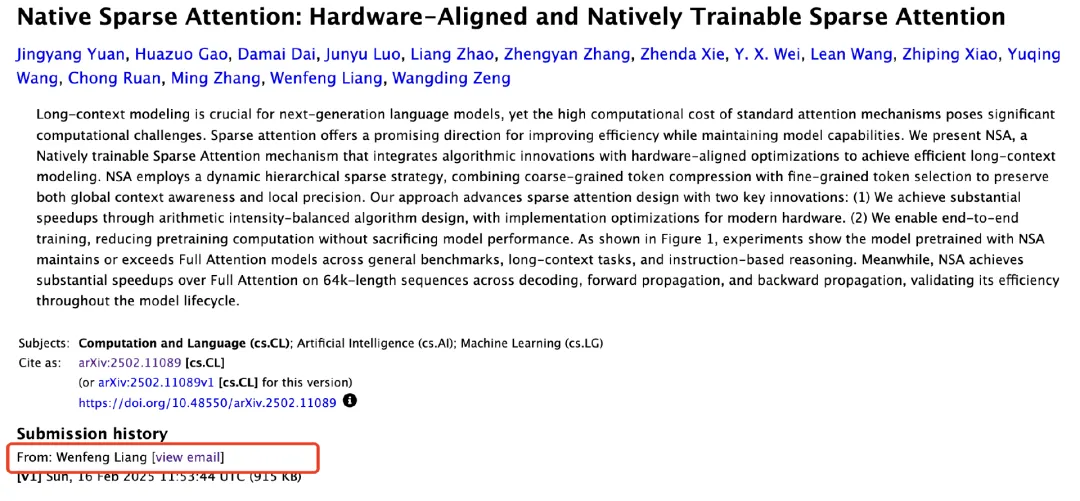2 月 18 日,DeepSeek 发布了一篇新论文,提出了一种新的注意力机制——NSA。值得注意的是,创始人梁文锋参与编写并亲自上传了该论文。