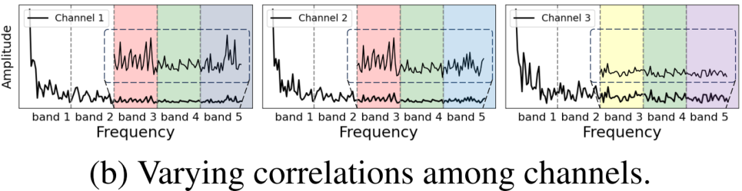 如图 (b) 所示,可以观察到不同频段上通道间关联性的变化。在第三频段上,通道一和通道二相似,但与通道三不同;在第四频段上,所有通道都相似,但在第五频段上又呈现出差异。