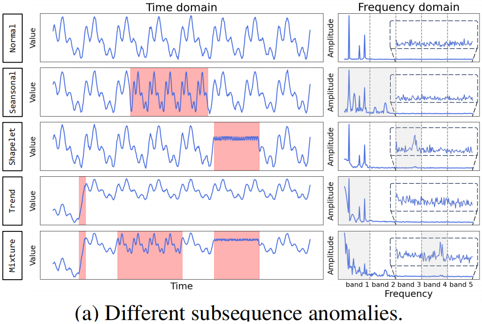 如图 (a) 所示,可以看到季节性 (Seansonal) 异常和趋势性 (Trend) 异常主要体现在低频段上,而形状特征 (Shapelet) 异常和混合性(Mixture) 异常会体现在中高频段上。