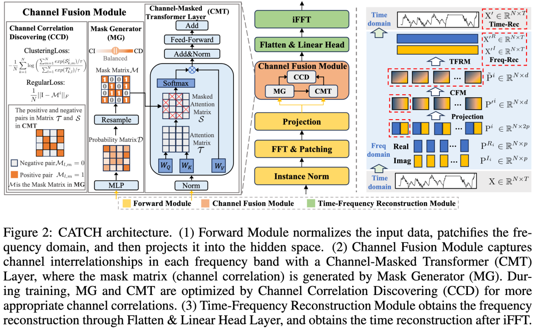 图2展示了 CATCH 框架的整体架构,它主要由三个主要模块组成:正向模块,通道融合模块(CFM),以及时频重构模块(TFRM)。