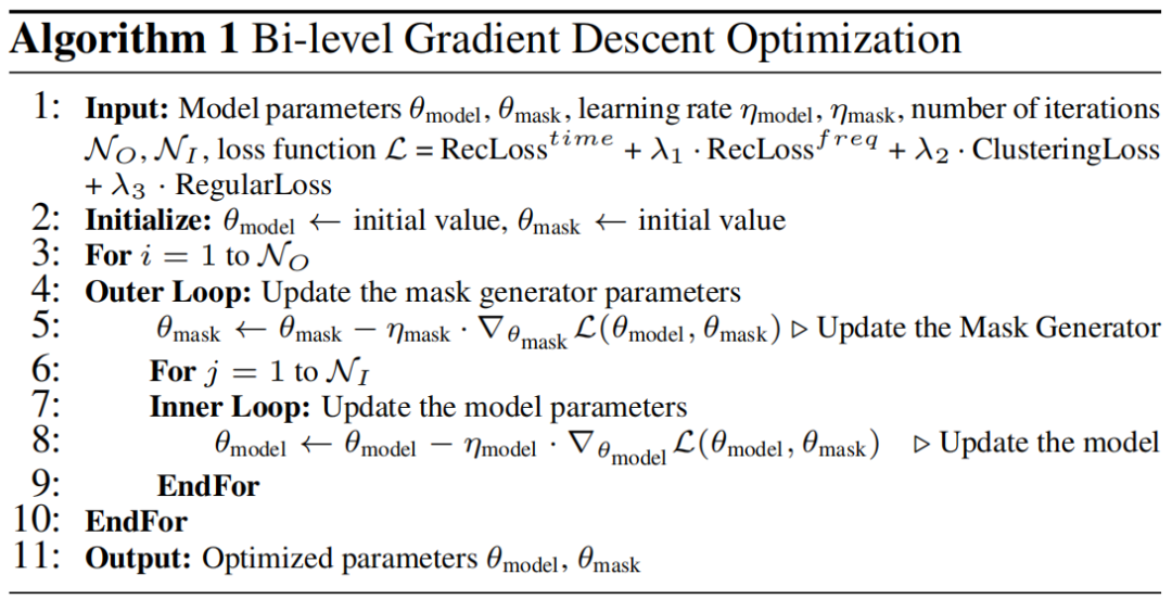 总损失 主要由时域重构损失 和频域重构损失 ,通道相关性发现机制 (CCD) 中的 ClusteringLoss 和 RegularLoss 组成。