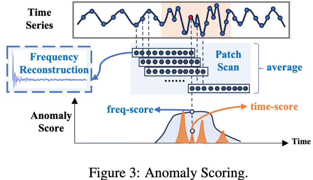 本文通过滑动窗口覆盖分析了每个时域上的点可能处于的子序列异常,并在频域上计算这些滑动窗口的异常得分,取均值得到频域异常分数(freq-score)综合评判该点是否处于子序列异常中,同时也计算了每个点的时域异常分数(time-score)来评判该点是否存在点异常。最终的异常分数是两者的加权和,从而兼具了检测点异常和子序列异常的能力: