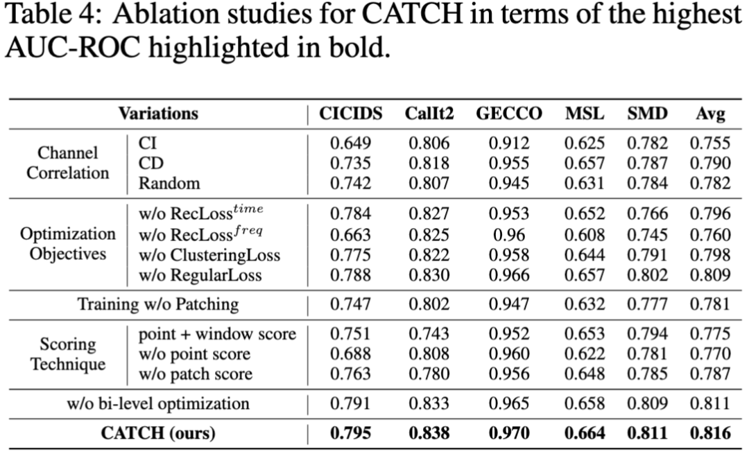 文中进一步提供了一系列消融实验来验证模型框架设计的合理性。实验表明,CATCH 的设计在提升异常检测效果上是有效的。