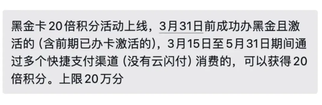 3月31日前成功办理黑金卡且激活(含前期已办卡激活的),3月15日至5月31日期间通过多个快捷支付渠道(不含云闪付)消费,可获得20倍积分。上限20万分,限主卡。