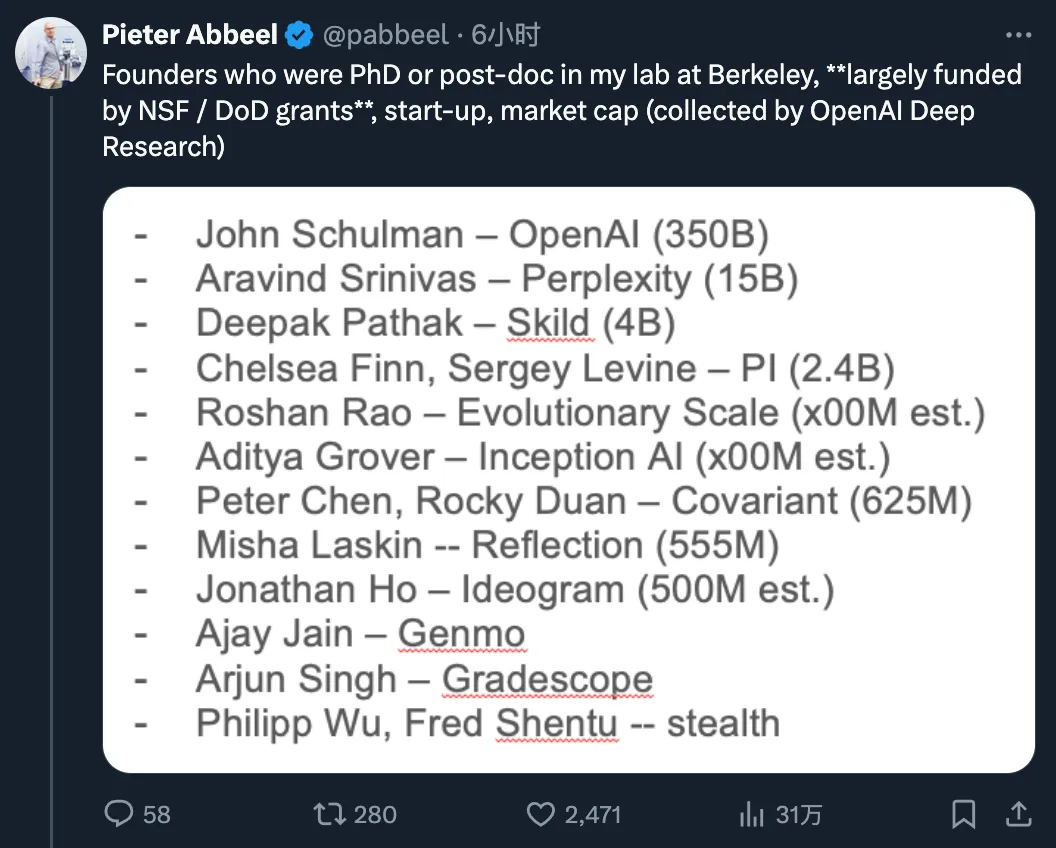 加州大学伯克利分校 Pieter Abbeel 实验室走出了 OpenAI、Perplexity AI 等12家明星 AI 初创公司创始人!