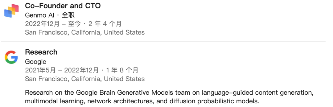 他曾在 Google Brain 工作,创建了首个文本到 3D 生成模型。2022 年 12 月,他共同创立了 Genmo AI 并担任 CTO,这是一家专注于视频生成的 AI 公司。