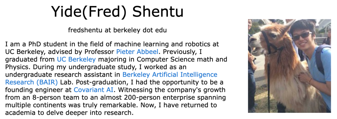 Yide (Fred) Shentu 现为 Pieter Abbeel 的博士生。他本科同样就读于加州大学伯克利分校,主修专业为物理以及数学和计算机科学。本科期间,他曾在 BAIR(伯克利人工智能研究实验室)担任研究助理。本科毕业后,他曾担任机器人公司 Covariant AI 的创始工程师和研究科学家。